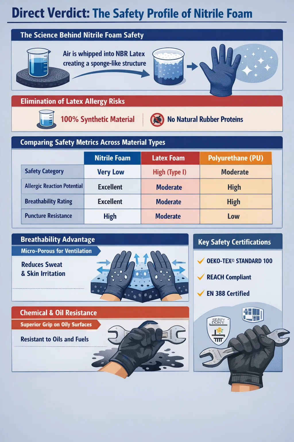 Salah satu halangan keselamatan terbesar dalam perlindungan tangan industri ialah kelaziman alahan lateks Jenis I. Sarung tangan nitril dan varian bersalut buih menawarkan penyelesaian muktamad. Oleh kerana ia diperbuat daripada kopolimer akrilonitril dan butadiena terbitan petroleum, ia kekurangan protein organik yang mencetuskan tindak balas imun yang teruk, menjadikannya selamat untuk kegunaan "sejagat" dalam tenaga kerja yang pelbagai.
