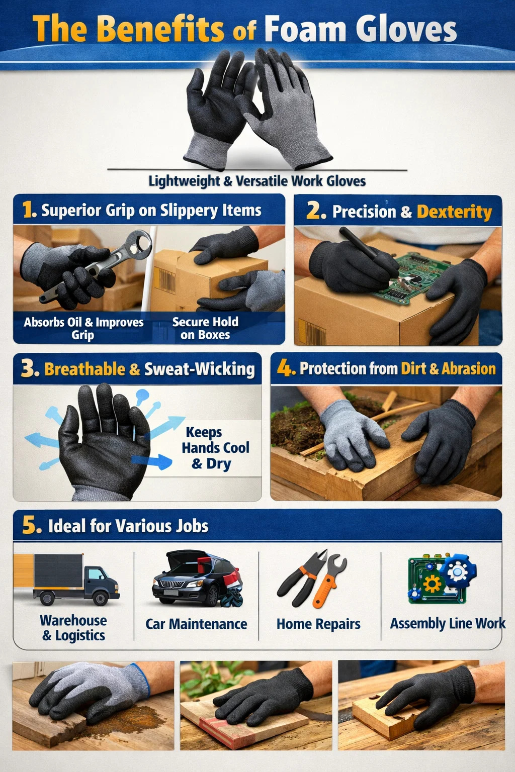Penyerapan Minyak dan Ketahanan Slip: Apabila membaiki kereta atau mengendalikan mesin, tangan anda sering berminyak. Sarung tangan plastik biasa menjadi tidak boleh digunakan apabila berminyak, tetapi salutan sarung tangan buih bertindak seperti span, dengan banyak liang kecil yang menyerap sebahagian daripada minyak dan air permukaan, membolehkan anda mencengkam bahagian dan sepana dengan mantap.