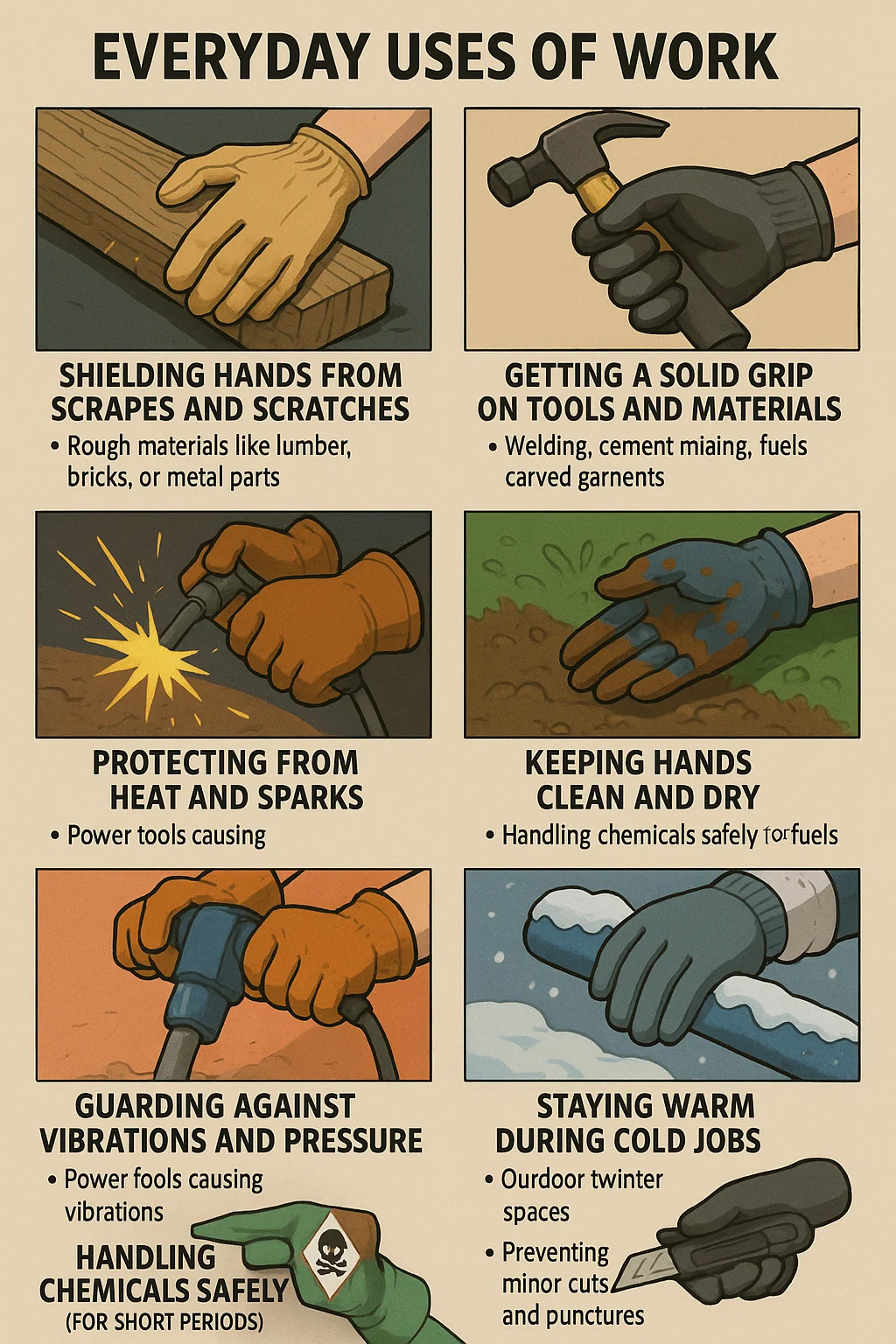 Apabila mengendalikan bahan kasar seperti kayu, batu bata, blok konkrit, atau bahagian logam, sarung tangan kerja bertindak seperti perisai. Mereka berhenti serpihan, tepi tajam, dan permukaan kasar daripada mencederakan kulit anda.