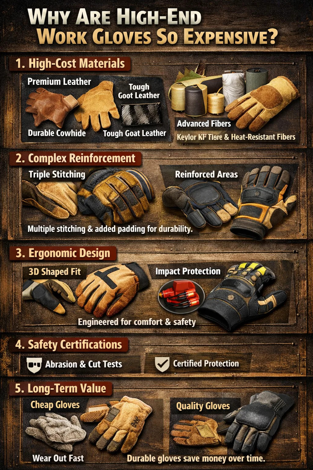 Sepasang sarung tangan murah berharga beberapa dolar mungkin berlubang selepas hanya sehari bekerja, memaksa anda untuk sentiasa membeli pengganti. Walau bagaimanapun, sepasang sarung tangan kerja berkualiti tinggi yang tahan selama enam bulan mungkin berakhir dengan kos yang lebih rendah setiap hari daripada yang lebih murah. Nilai jangka panjang yang diperoleh daripada ketahanan ini adalah satu lagi sebab untuk harga premium.